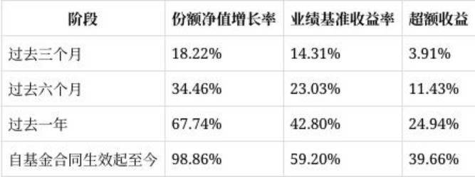 拉长周期看,过去六个月、一年及自成立以来净值增长率分别为34.46%、67.74%、98.86%,均大幅跑赢基准的23.03%、42.80%、59.20%,累计超额收益达39.66%。