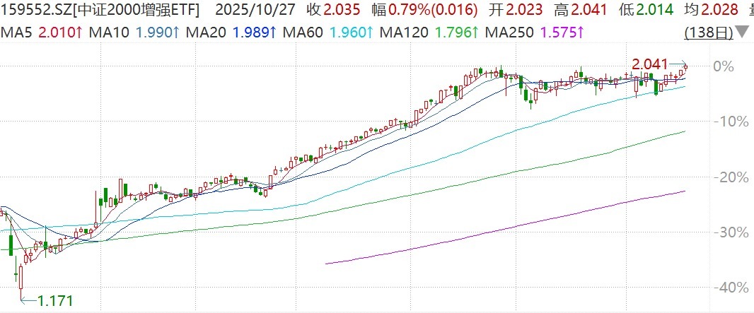 A股高开高走,10月27日午后,沪指涨超1.1%,冲击4000点关口,热点持续扩散。盘面上看联合证券,电子化学品、船舶制造、钢铁、小金属等板块概念涨幅居前。中证2000增强ETF(159552)涨0.79%,盘中刷新上市以来新高。