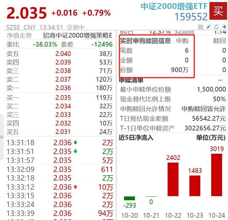 随着市场风险偏好回暖,中证2000增强ETF(159552)近日连续“吸金”,Wind数据显示,截至发稿,今日盘中该ETF获净申购900万份,此前3个交易日获资金连续净流入约6900万元。